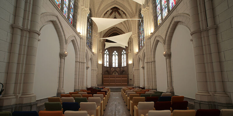 L’installation de 4 toiles en tissu Acoustis® 50 au plafond de l’allée centrale et 2 toiles plus petites dans ceux du transept, a été étudiée pour une correction acoustique parfaite permettant :