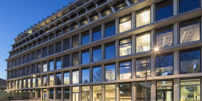 320 stores à enroulement ZIP de tissu Satiné 5500 coloris 0130 Gris Charcoal, soit 6 000 m², sont déployés sur la façade sud et se déclinent entre :